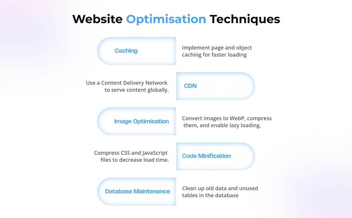- Code minification: Compress CSS and JavaScript files to reduce load time.