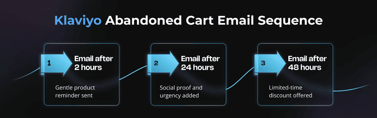 - Email after 24 hours → add social proof with urgency (like “people love this item, don’t miss out”).