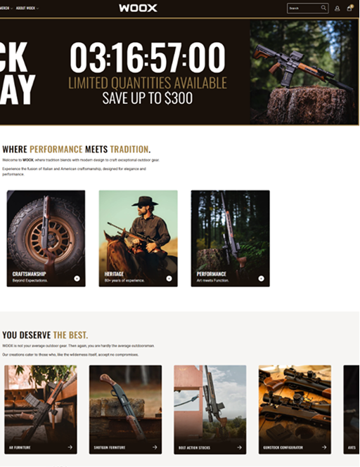 A premium Shopify-PLUS-powered store built for Woox – an 85-years old outdoor gear retailer offering Italian-crafted gunstocks, chassis, axes, and knives.